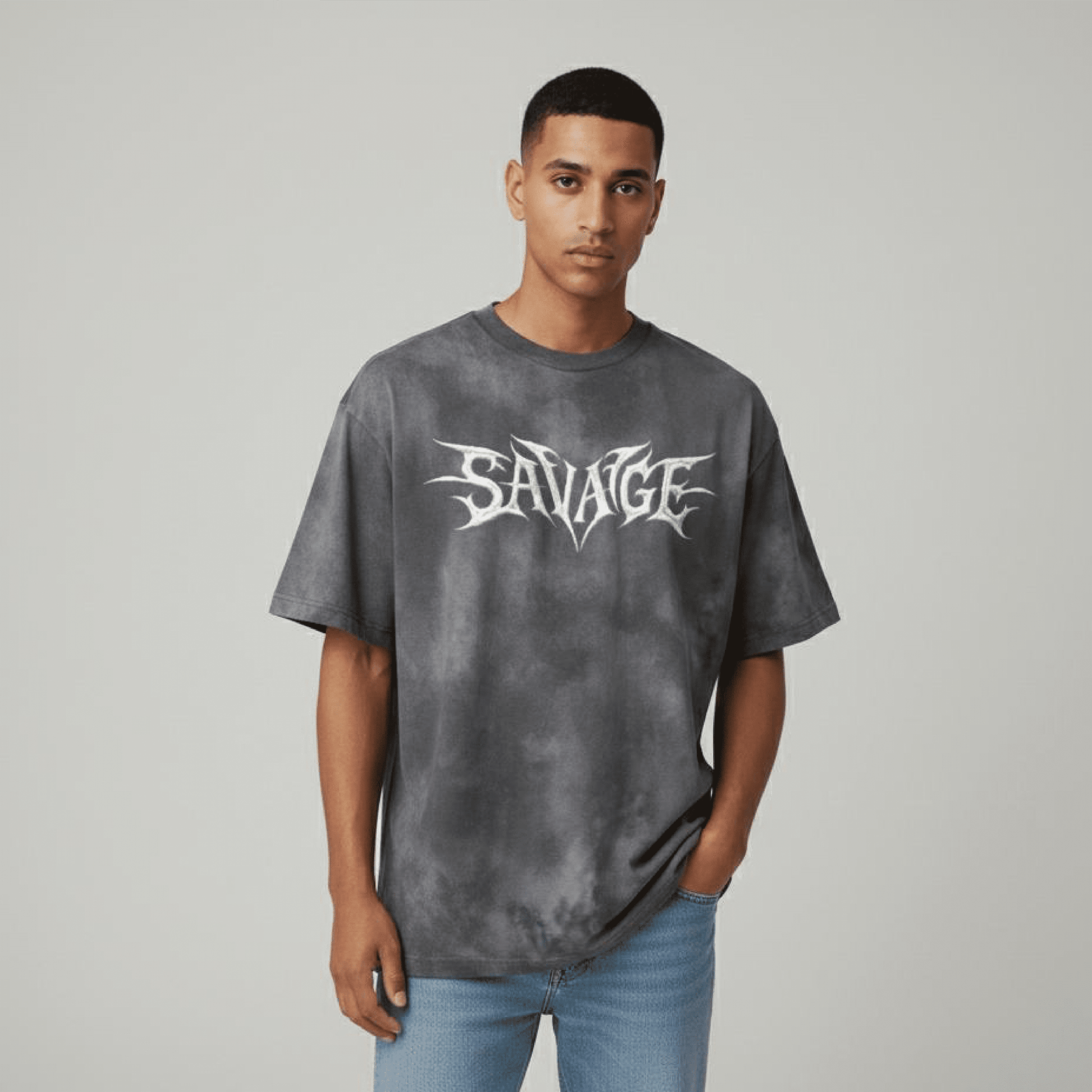 The Savage Oversized Tee is built for those who don’t blend in. Crafted in a vintage-washed charcoal tone with a bold, spiked ‘SAVAGE’ logo across the chest, this tee channels raw street energy and attitude. Made from soft, heavyweight cotton for maximum comfort and durability, it’s perfect for pairing with cargos, ripped jeans, or joggers. Whether you’re hitting the streets or just chilling, this tee says it all — you’re built different